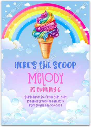Host a successful birthday party starting with this ice cream cone rainbow invite! The printed dimensions are 5"x7".