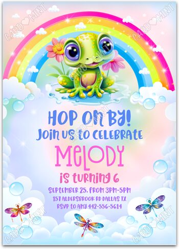 Host a successful birthday party starting with this froggie rainbow invite! The printed dimensions are 5"x7".