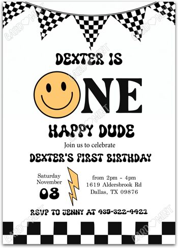 Host a successful first birthday party starting with this checkered flag yellow/black invite! The printed dimensions are 5"x7".