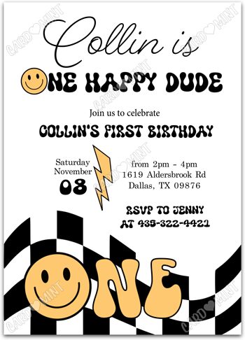 Host a successful first birthday party starting with this checkered flag yellow/black invite! The printed dimensions are 5"x7".