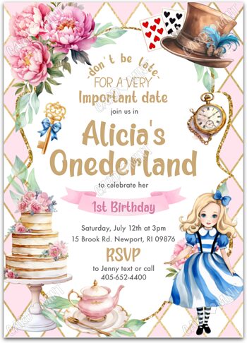 Host a successful first birthday party starting with this wonderland characters colorful invite! The printed dimensions are 5"x7".