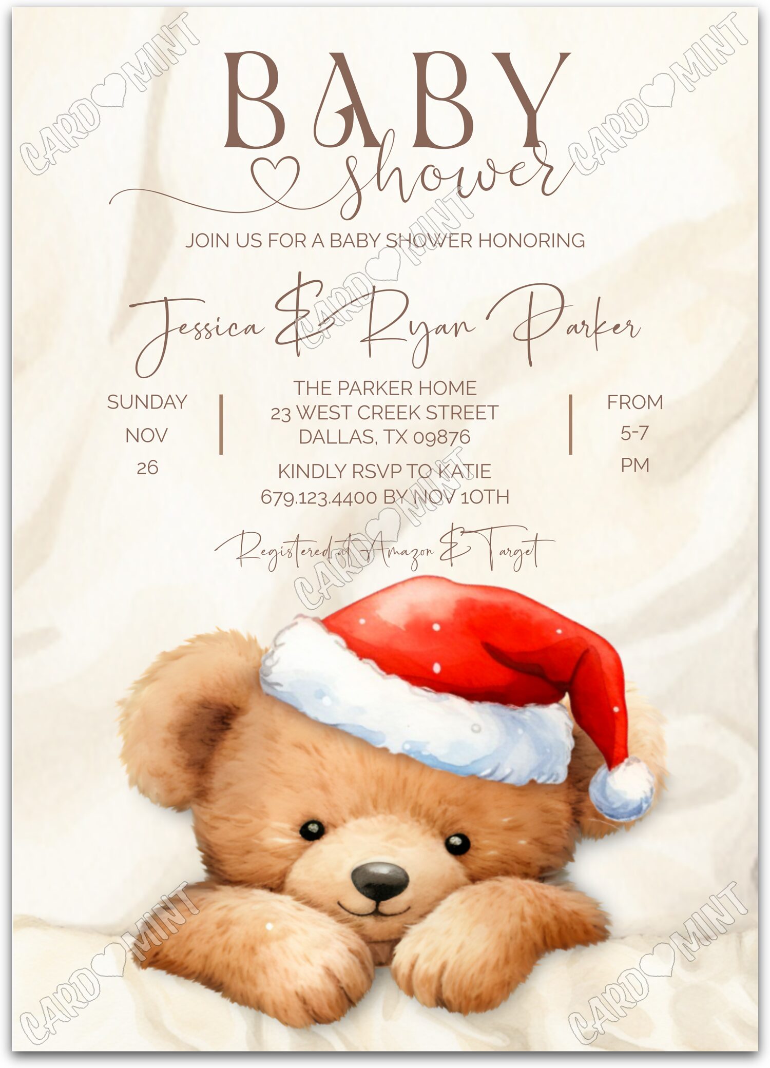 Host a successful christmas baby shower starting with this winter teddy bear in santa hat beige invite! The printed dimensions are 5"x7".