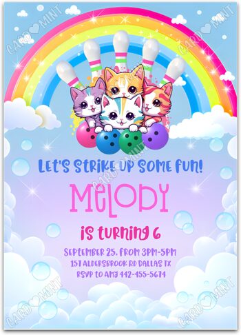 Host a successful birthday party starting with this bowling kittens rainbow invite! The printed dimensions are 5"x7".