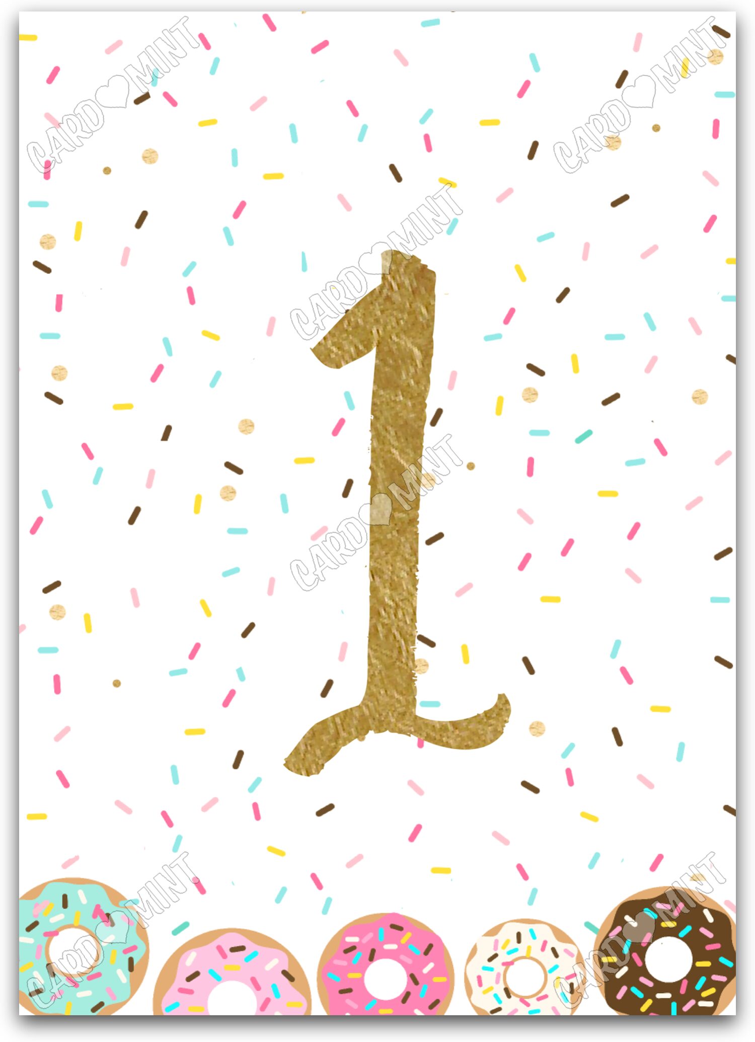 Host a successful first birthday party starting with this donut gold invite! The printed dimensions are 5"x7".