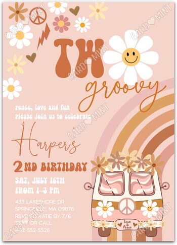 Host a successful 2nd birthday party starting with this peace van & symbols terracotta invite! The printed dimensions are 5"x7".