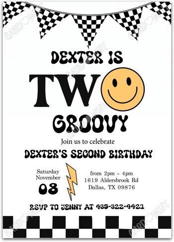 Host a successful 2nd birthday party starting with this checkered flag black invite! The printed dimensions are 5"x7".